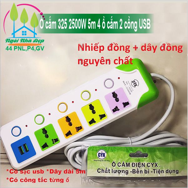 4 lỗ cắm 3 chấu, 2 cổng USB, dây dài 5m