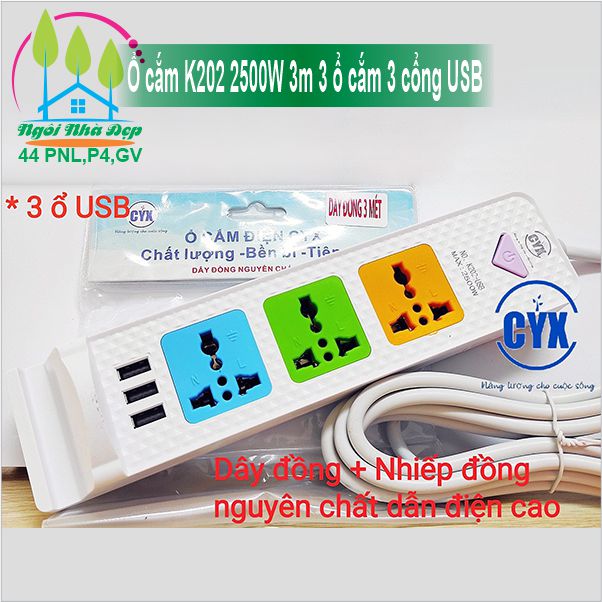 Ổ cắm K202 2500W 3m 3 ổ cắm 3 cổng USB